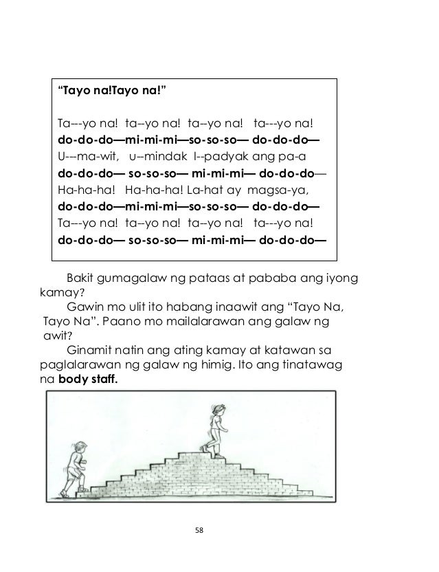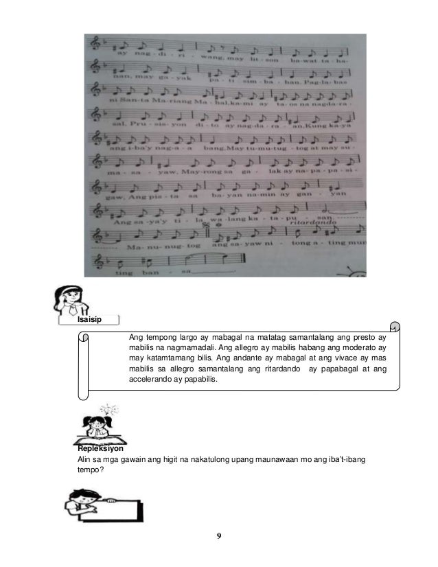 Sa musika, may mga awit na mabilis at mabagal. Ang bilis ng isang awit ay tinatawag na tempo. Katulad ng dynamics (lakas at hina ng tunog), ang tempo (bilis) ng awit. Madalas itong nakikita sa mga pambatang kanta upang mas matandaan agad ang tono nito at makabisado. There are 60 lyrics related to halimbawa ng awiting pambata na. Mabilis na kantang tagalog. Kalimitang ginagamit sa gamu. ★★ tamang sagot sa tanong: Hello!, can u answer this please ty!