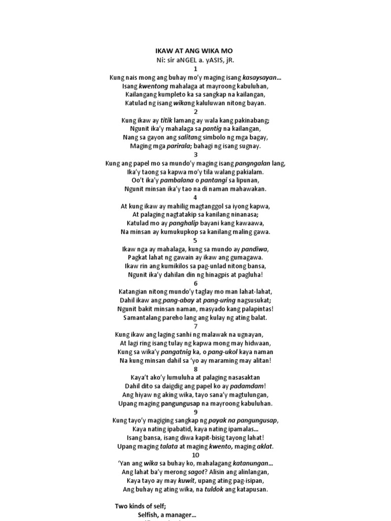 Tula ni:gleyden devera callejo wika ng pambansa i wika ng pambansa ay ating kailangan, ating payabungin wikang kinagisnan, wikang filipino huwag kalimutan, itatak palagi sa puso’t isipan. Ii wika ng pambansa ay pahalagahan, bilang mamamayan ating karapatan, Proyekto sa filipino lumikha ng isang tula na may sukat at tugma at may. Disiplina, at paggalang sa kapuwa.