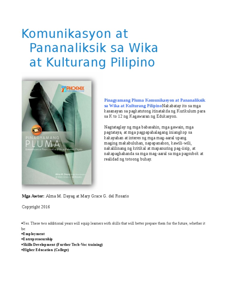 Senior High School Book: Pinagyamang PLUMA, KOMUNIKASYON AT Latest