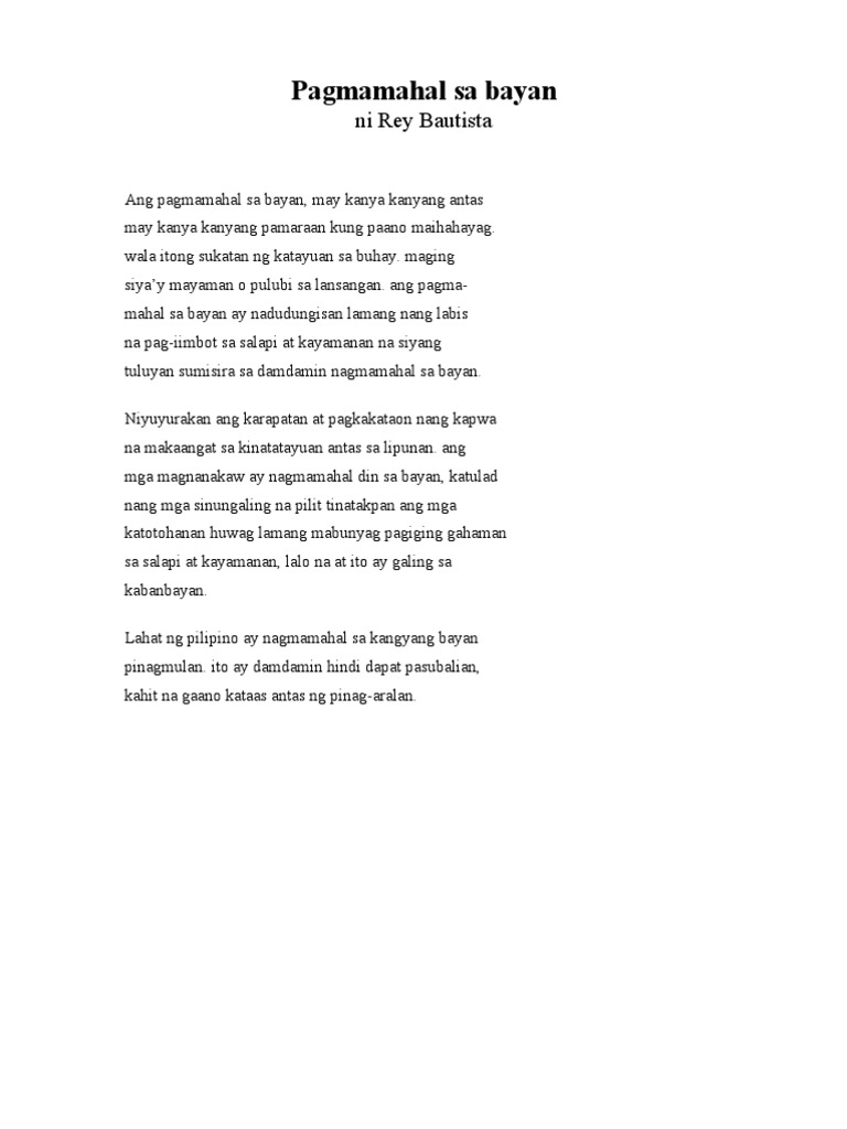 Maraming pamamaraan upang maipakita natin ang pagpapahalaga natin sa ating sariling kultura. Ang tula o “poem” sa ingles ay isang uri sining o panitikan na kilala dahil sa malayang paggamit ng wika sa iba’t ibang anyo at estilo. Ito ay isang uri ng panitikan na nag bibigay diin sa. Ito’y ang inang bayang tinubuan: Siya’y ina’t tangi sa kinamulatan. Find the answer to the question here: Gawain1 gumawa ng isang tula na nagpapakita ng pagmamalaki sa sting kultura. Gawain1 gumawa ng isang tula na nagpapakita ng pagmamalaki sa sting kultura. You might be interested in.