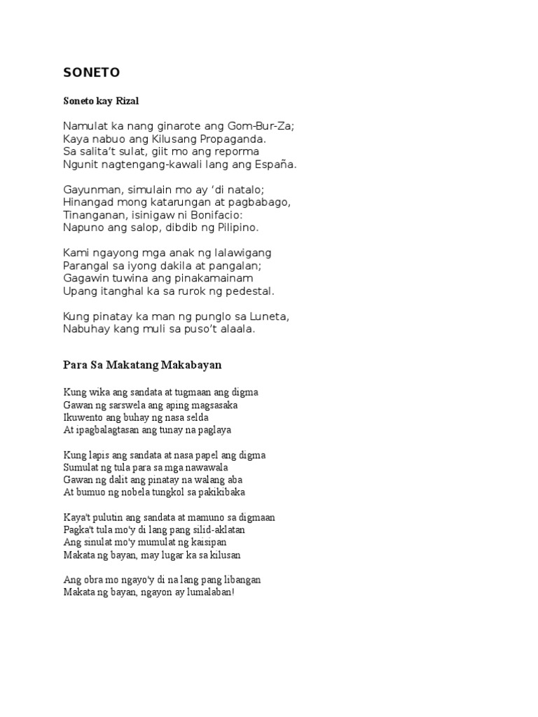 Wala ding tiyak na bilang ng mga taludtod. Tulang liriko tulad ng isang soneto o ng isang oda na ipinapahayag ang mga saloobin at damdamin ng makata. Sa lahat ng itoy wikang filipino ang daan. Siyang nanaluktok na anyong tula sa panahon ng paghingi ng pagbabago ng mga. Tula na pag ibig may 4 saknong 12 pantig. 5 stanza na tula filipino poem about prayer halimbawa ng tulang filipino tungkol sa pagdarasal o pananalangin limang saknong na tula. Ang ganda ng ating kalikasan. Sa unang bahagi ng. Soneto isang tula na karaniwang may 14 linyahinggil sa damdamin at kaisipan may malinaw na kabatiran sa likas na.