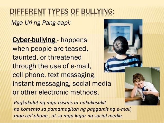 Naging isyu ang bullying noong ikadalawampu’t isang siglo dahil sa pagtaas ng teknolohiya. Ano ang epekto ng pambu bully dahilan ng panunukso pang aapi pang aasar away pananakit lapastangan pagmumura. Iba t ibang uri ng pananakit o bullying barobo municipal police station facebook. Gumagamit ng lakas gaya ng paghahagupit paninipa panunulak o iba pang uri ng pananakit. Narito ang ibat ibang uri ng bullying. Pagsasalita o pagsusulat ng. Malaki ang naging epekto ng kolonyalismo sa kultura ng pilipinas. Dahil sa pananatili ng mga mananakop sa pilipinas, ang mga tao sa ating bansa ay natutunan ang mga gawi ng mga dayuhan. Napagbabago nito ang pananaw ng isang indibidwal at napapamahal siya sa kultura ng bansang nanakop.