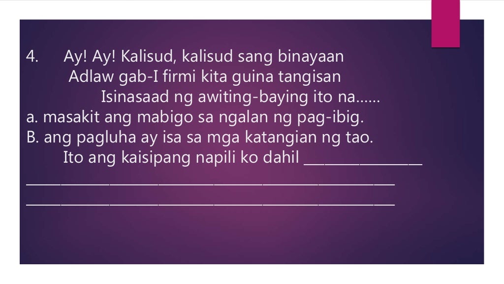 Ipagpatuloy mo lang dahil gagabayan pa rin kita sa lahat ng mga gawain na iyong gagawin. Awiting bayan at bulong ng kabisayaan 1. Alam mo ba na…. Ang pasalindilang panitikan ay naging laganap sa panahon ng ating mga ninuno bago pa man ang pananakop ng mga espanyol. O scribd é o maior site social de leitura e publicação do mundo. Tabi tabi po apo alisin mo po ang sakit ng pamilya ko 8.