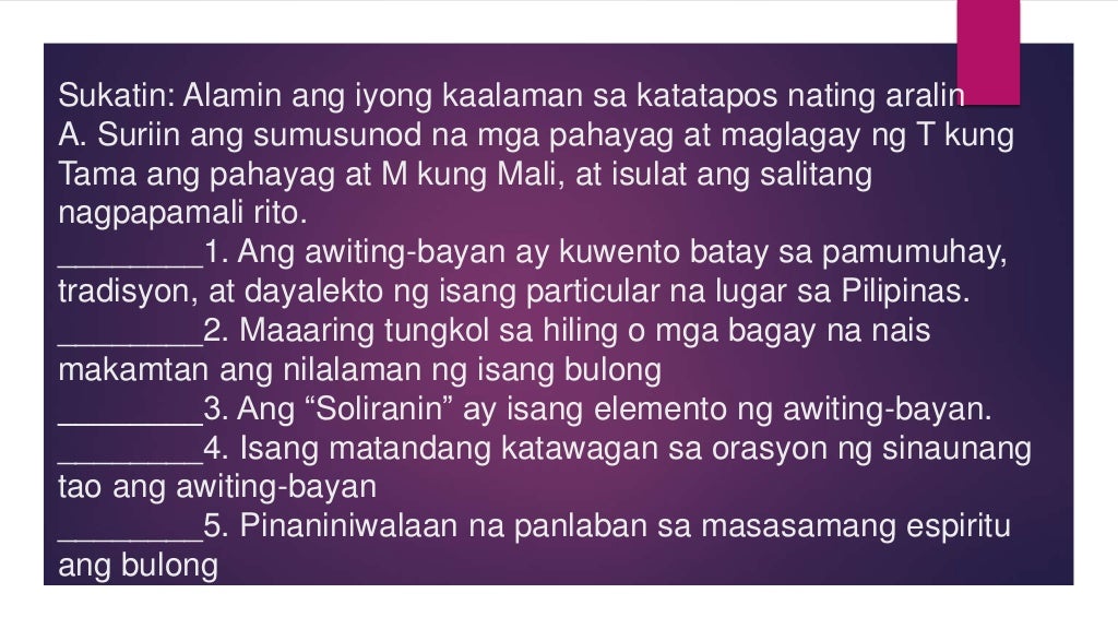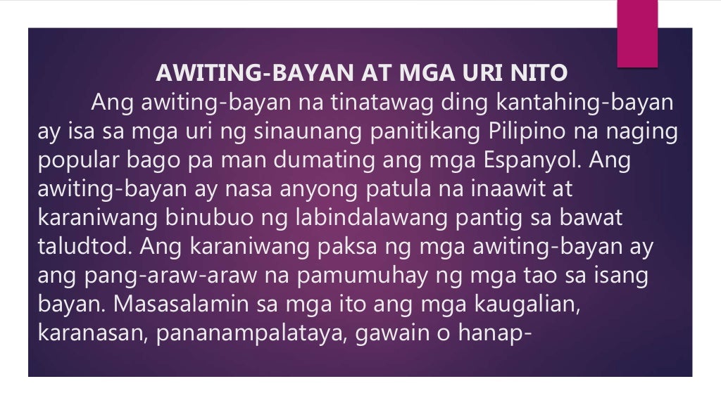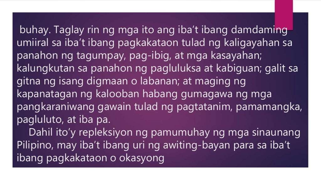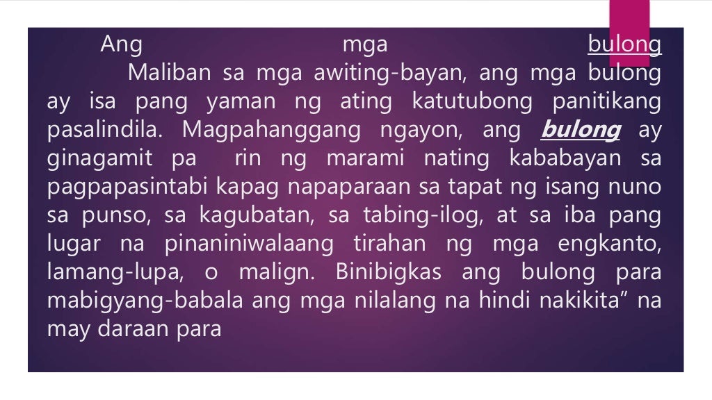 Ang awiting bayan o bulong rin ay isa sa mga panitikang naging tanyag o sikat bago pa man dumating ang mga mananakop sa pilipinas. Scribd is the world's largest social reading and publishing site. Scribd es red social de lectura y publicación más importante del mundo. Mga halimbawa ng uri ng bulong na nagtataboy ng masasamang diwa o maligno ay ang xristac ortac aminatac at umalayu deketam e pesan a ore ni kamalotan de tabiang ni makedepat.