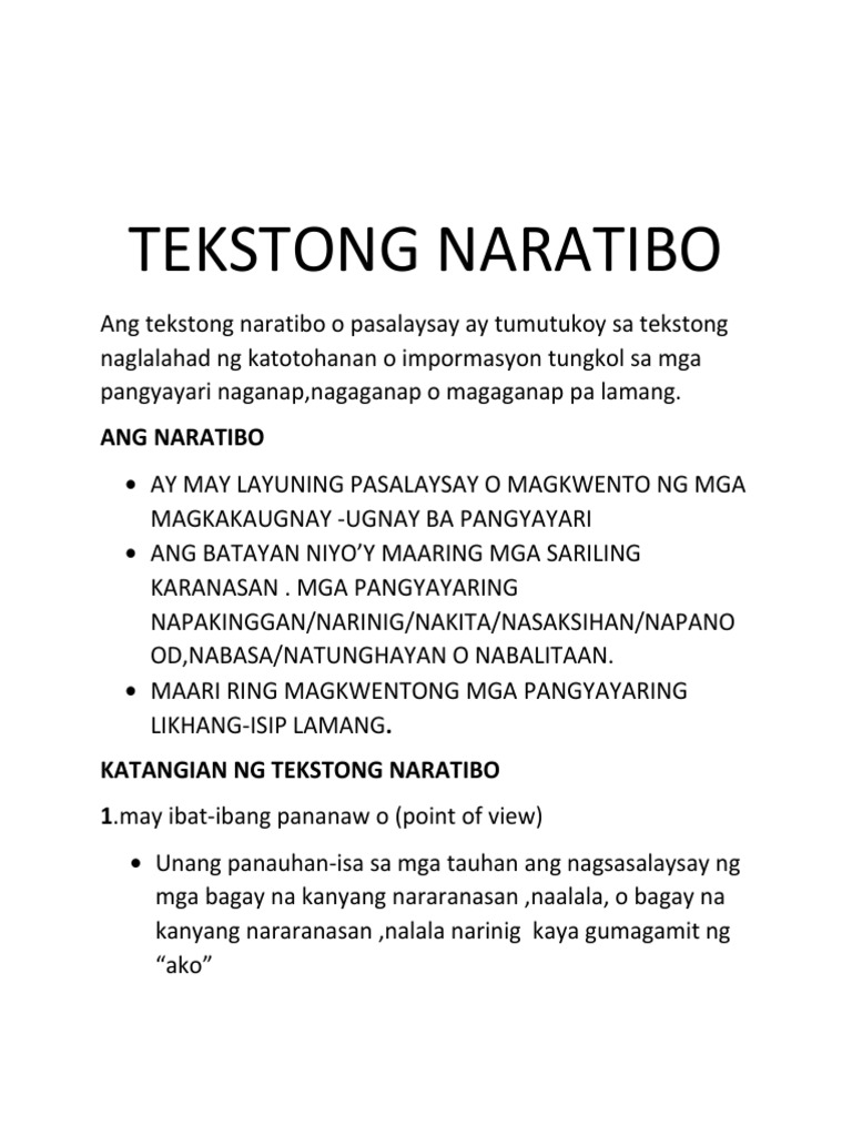 TEKSTONG NARATIBO: Ang tekstong naratibo ay pagsasalaysay o pagkukuwento ng mga pangyayari sa isang tao o mga tauhan, nangyari sa isang lugar at panahon o sa isang tagpuan nang may maayos na pagkakasunod-sunod mula simula hanggang katapusan. Pangunahing layunin ng ganitong uri ng teksto ang makapagsalaysay ng mga pangyayaring nakapanlilibang o nakapagbibigay-aliw o saya.